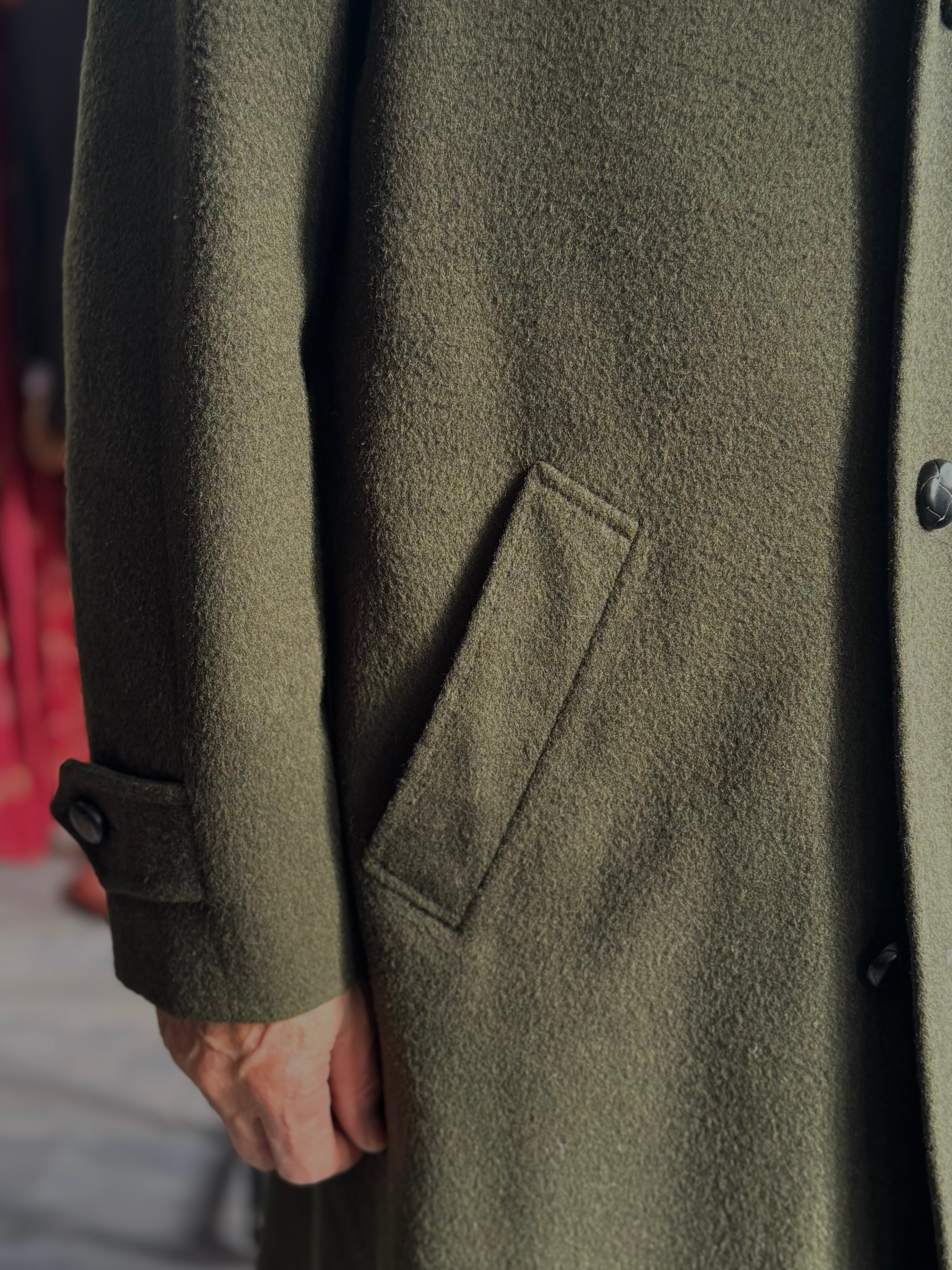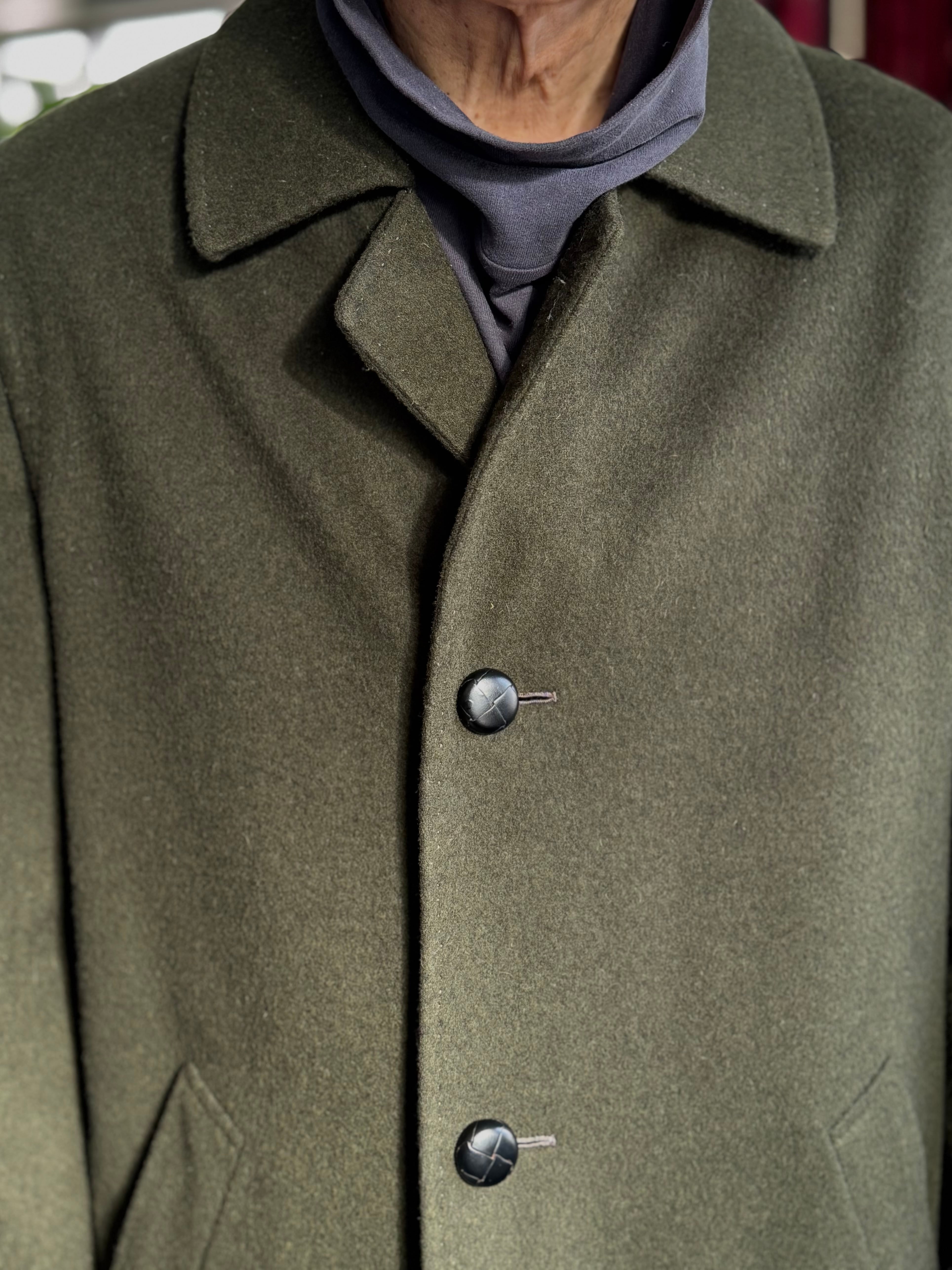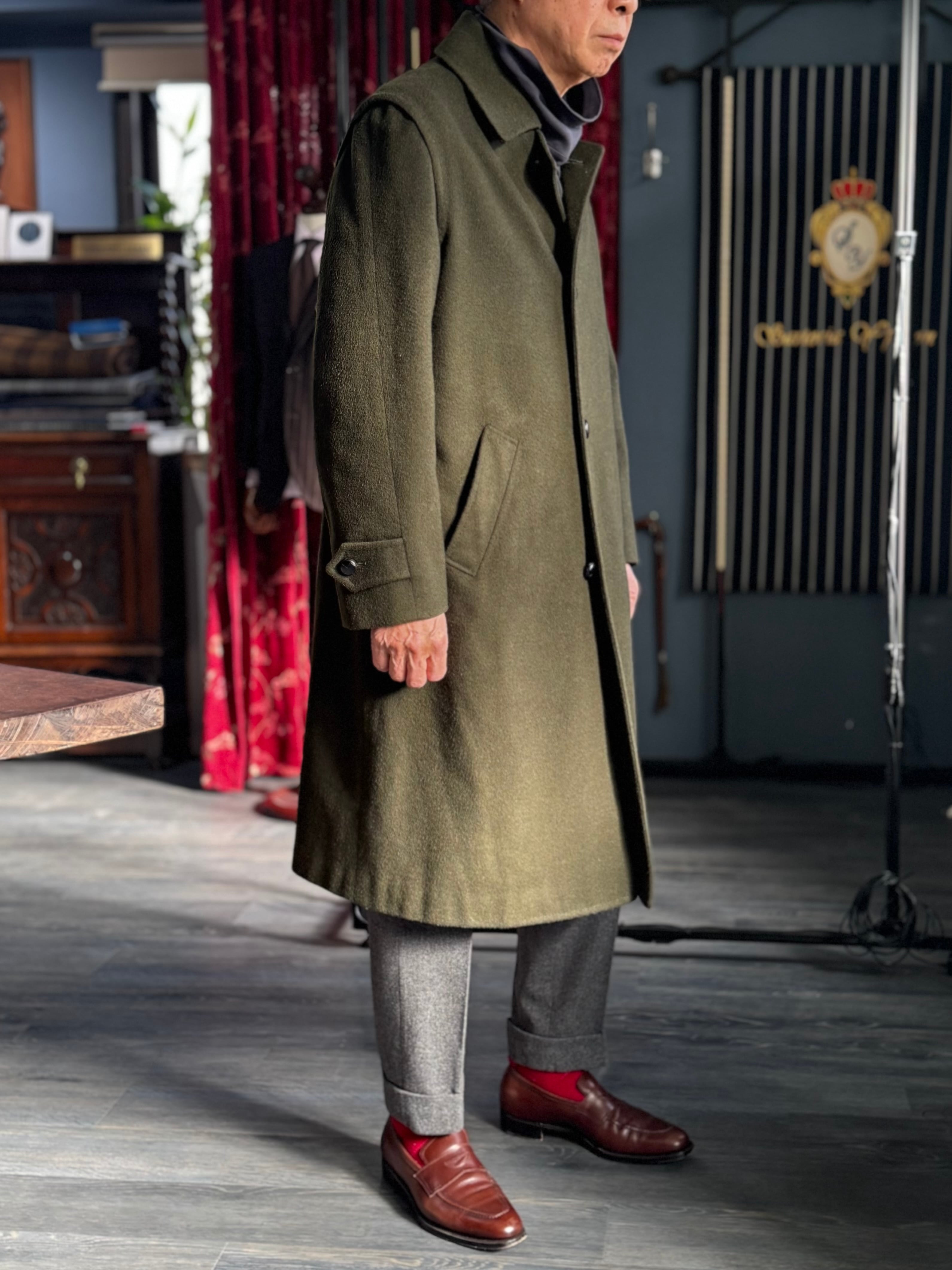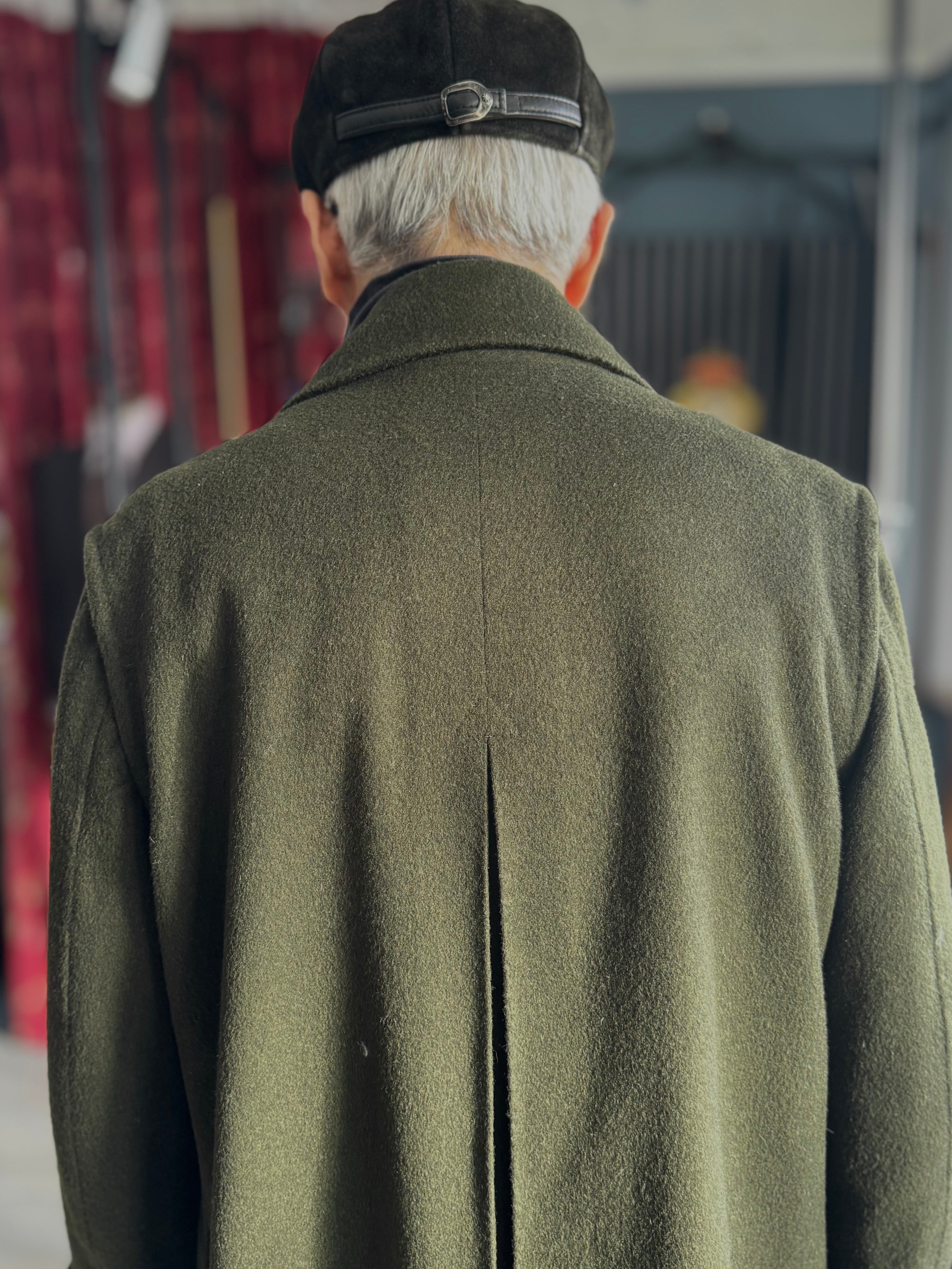 100%ウールの毛並みのある生地を使用したステンカラーのコート。革ボタンや各所に施された精緻なハンドステッチ、特徴的な袖山のディティールがこのコートをユニークで特別な1着にしています。