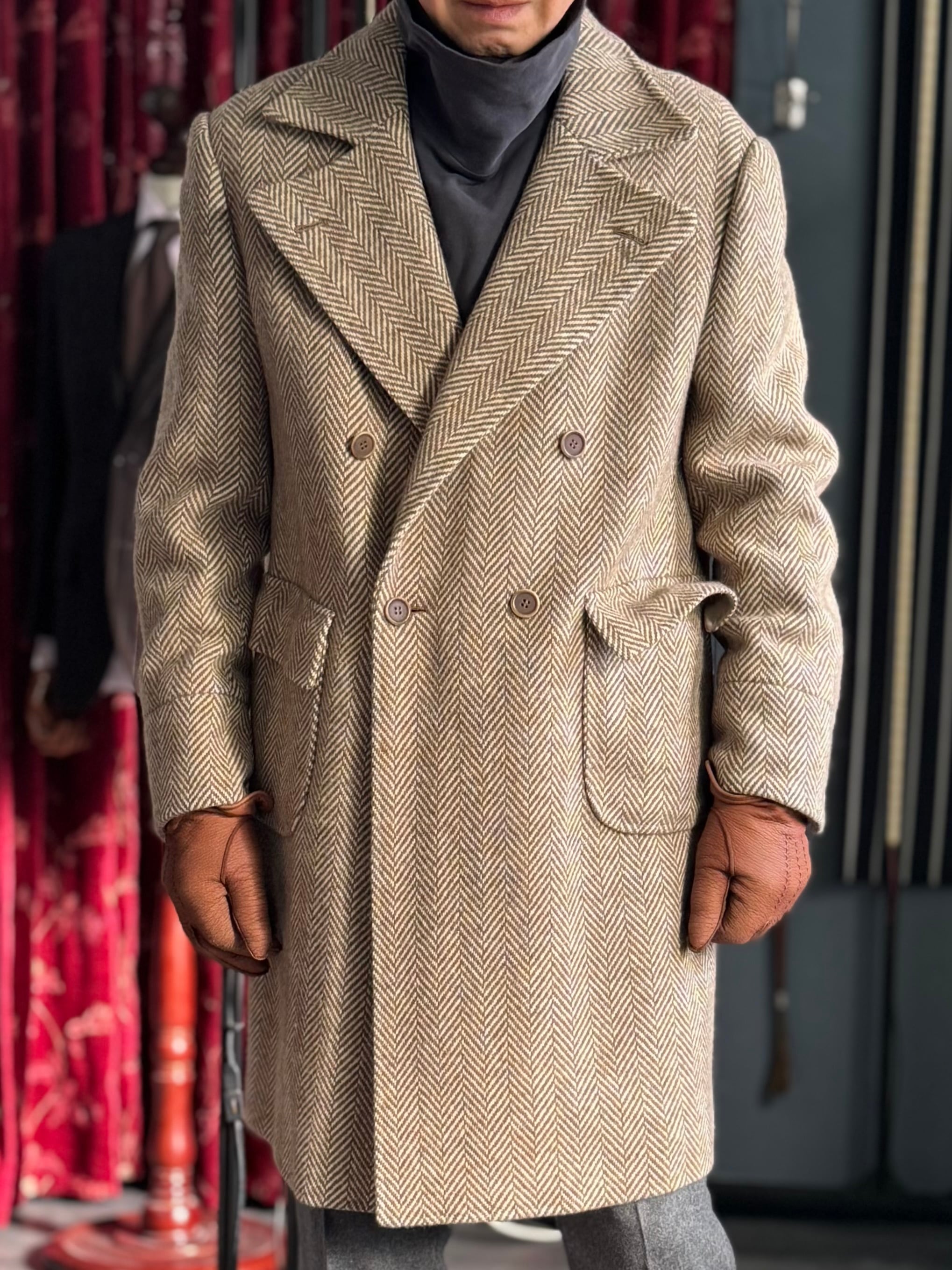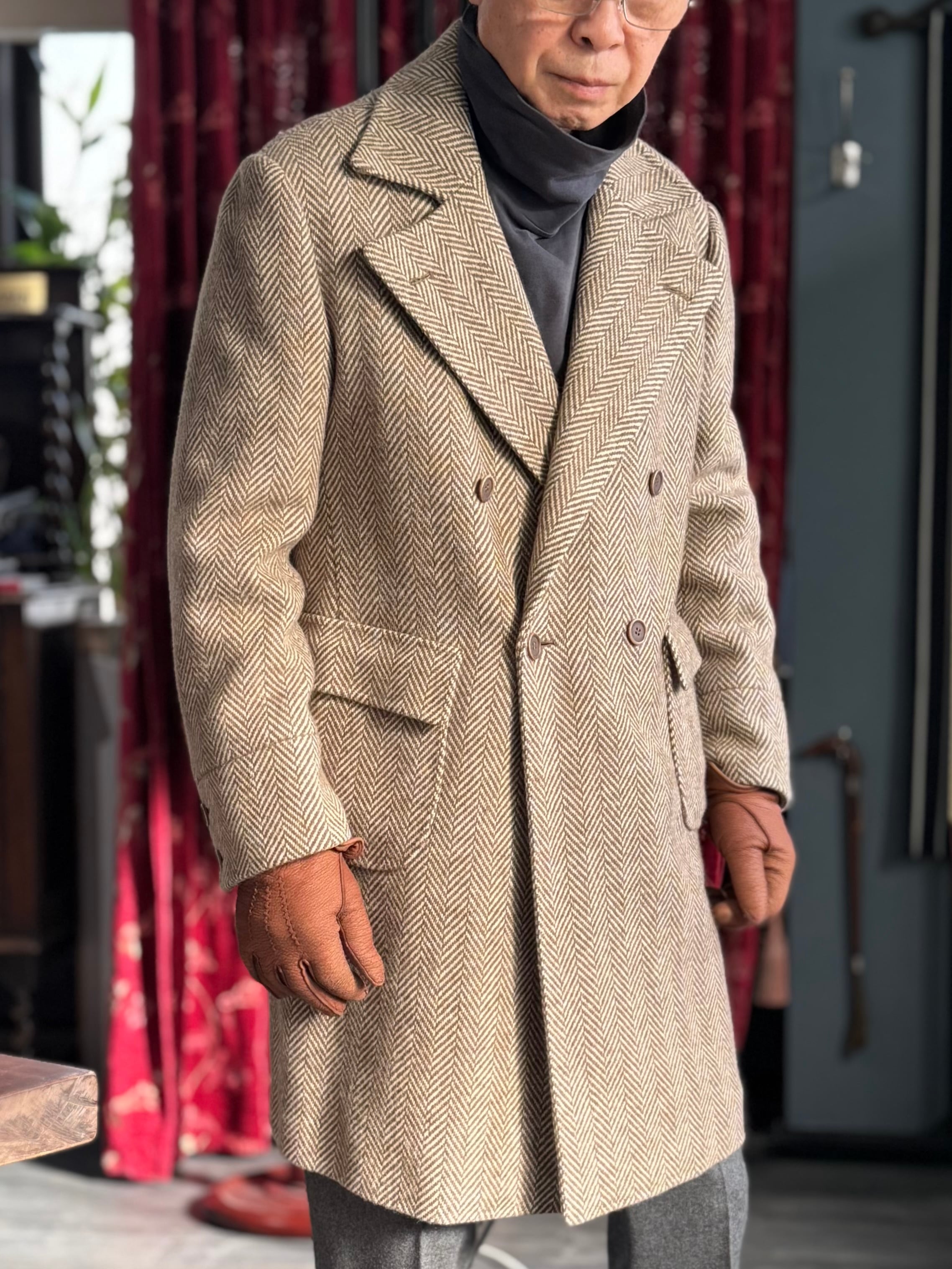 FOX BROTHERSのヘリンボーン生地で仕立てたコート。