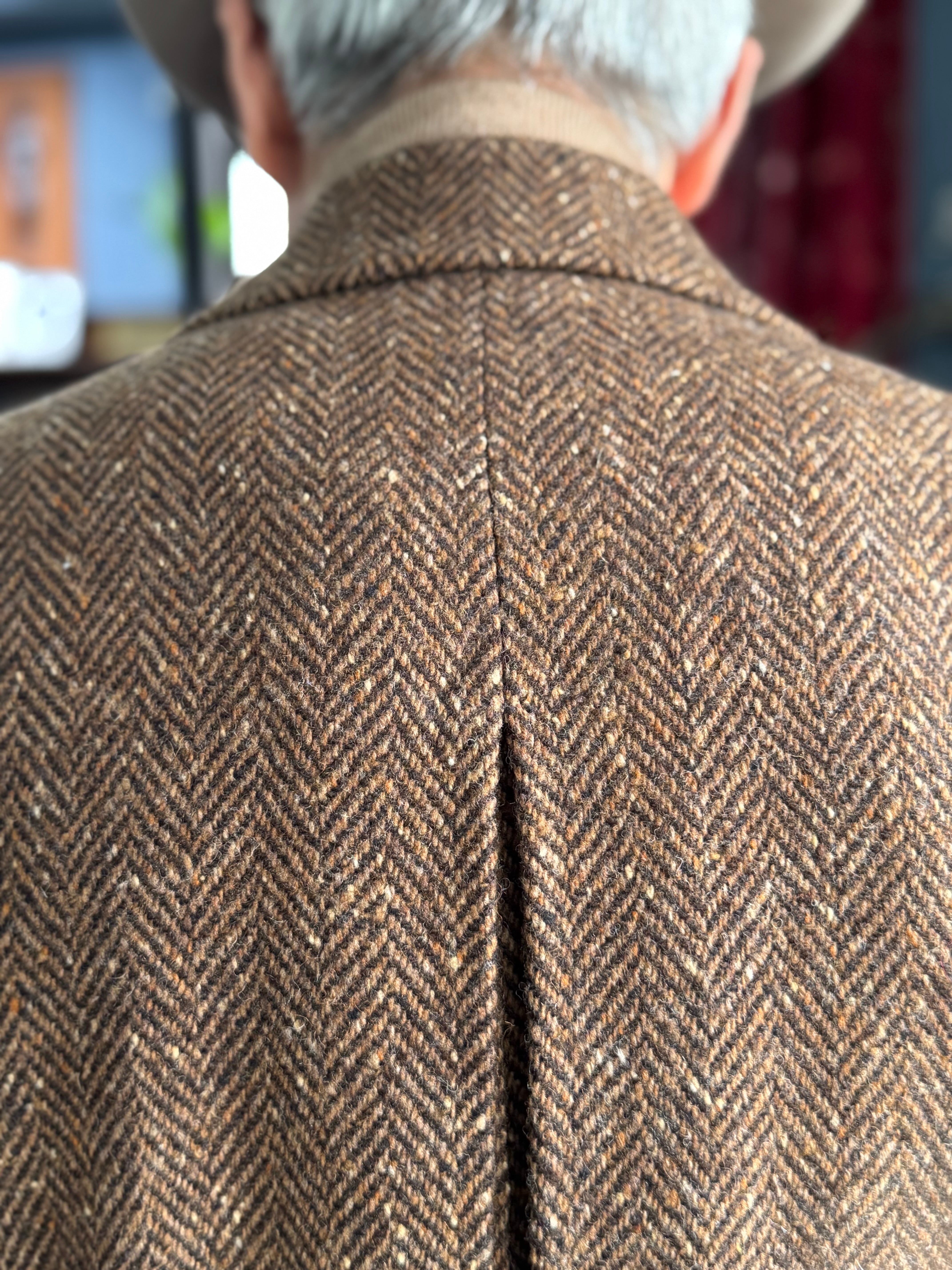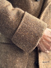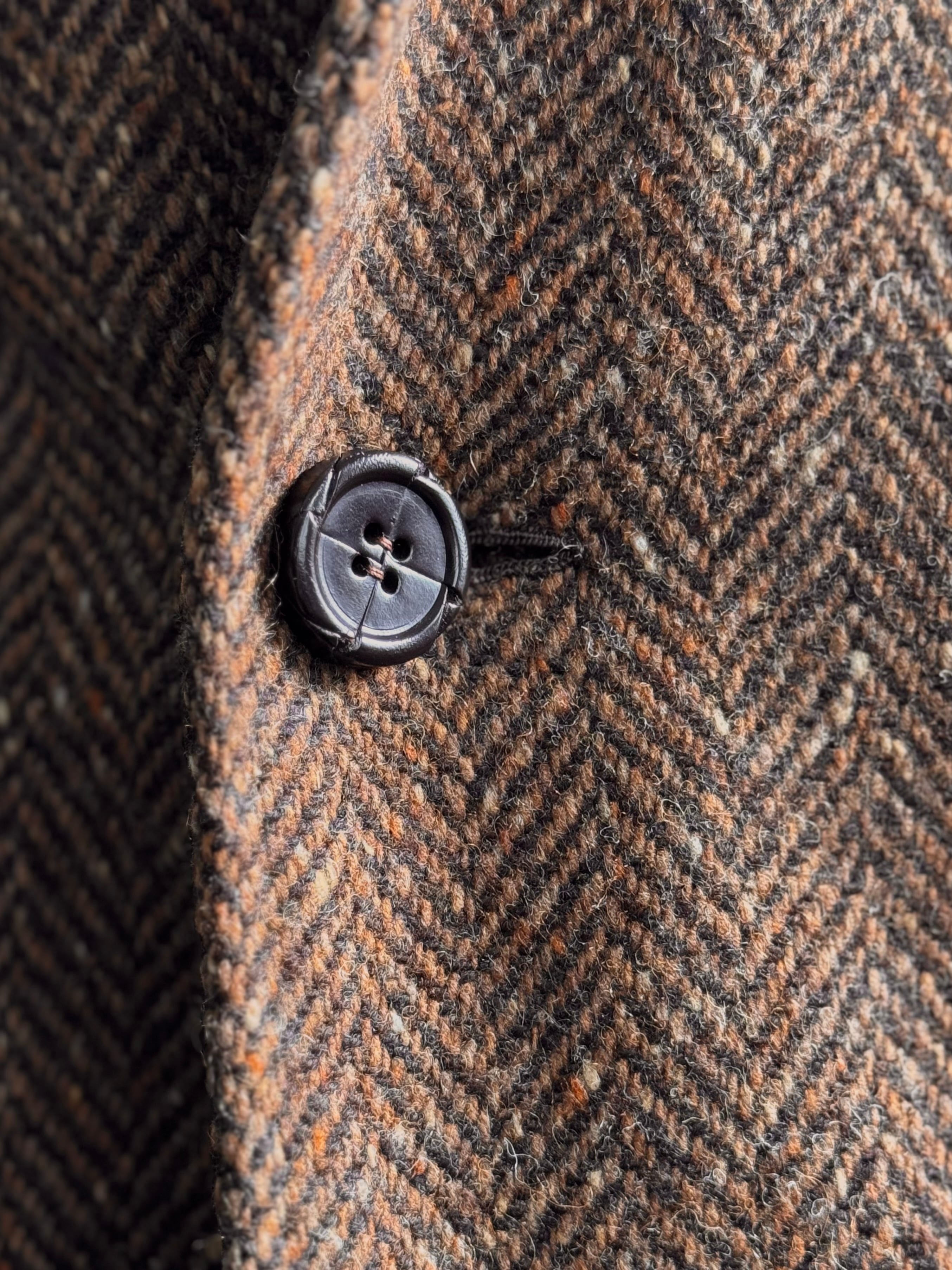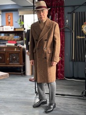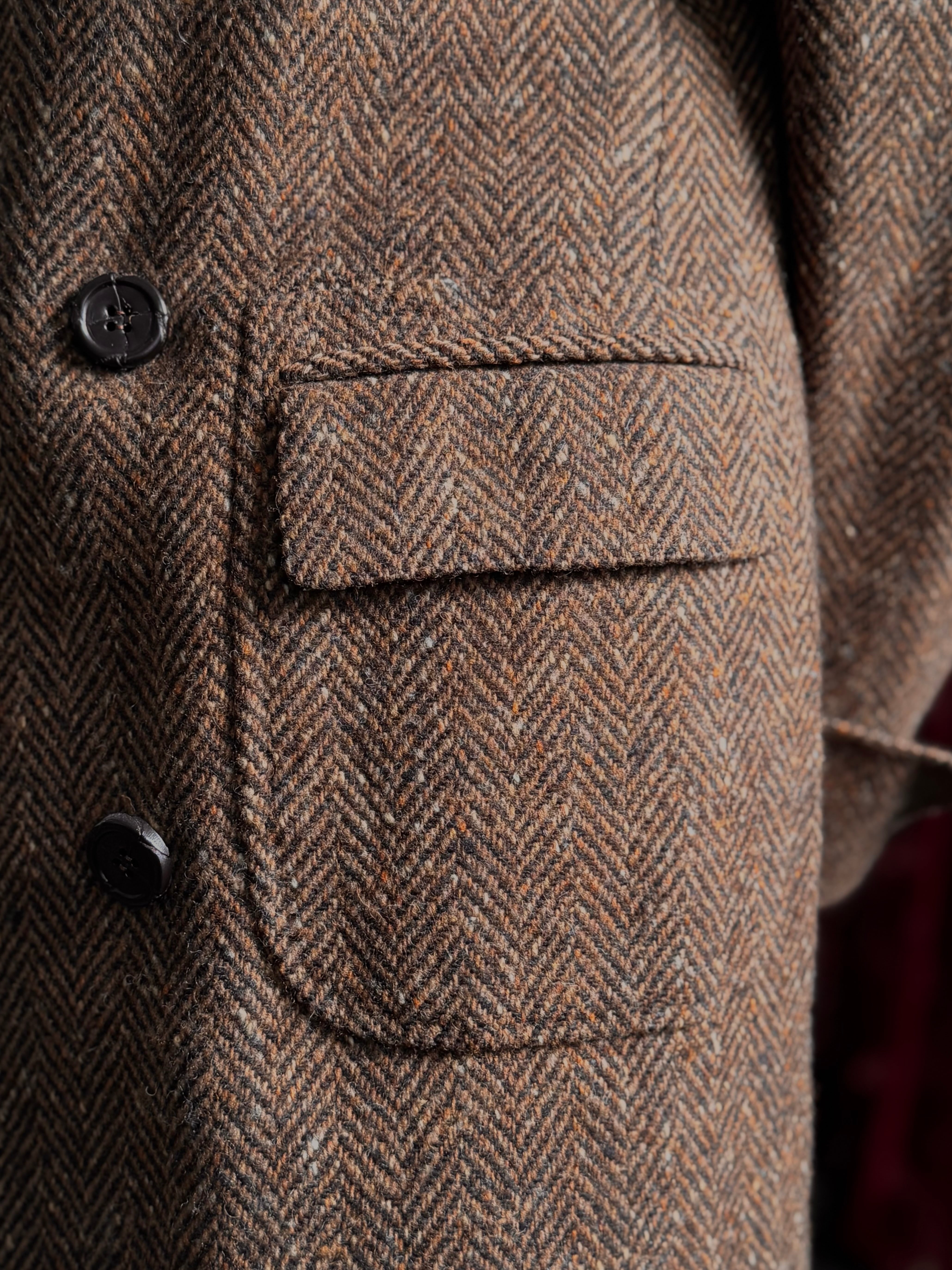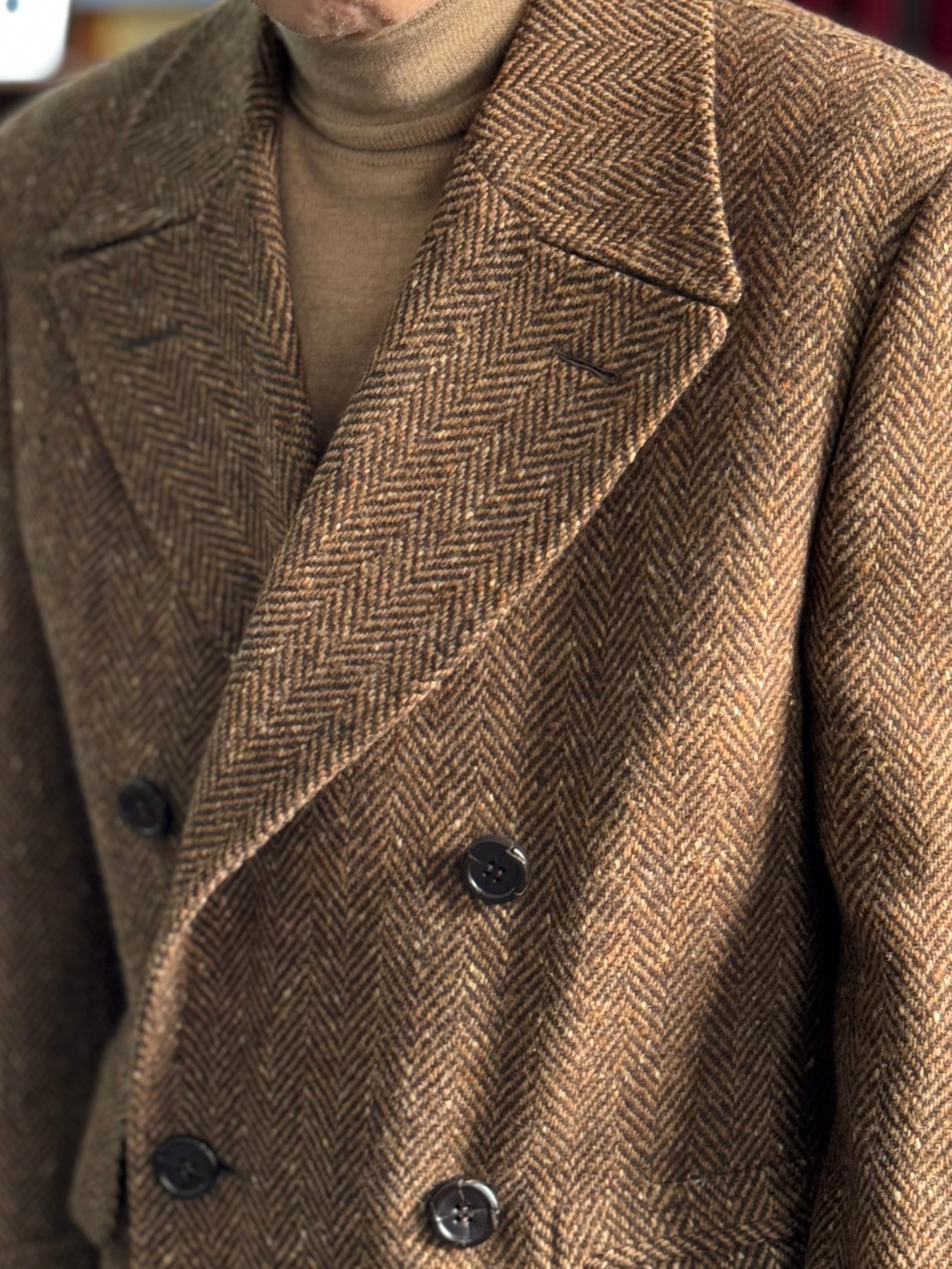 暖かみのあるツイードのヘリンボーン生地で仕立てられたダブルブレステッドコート。独特な生地の表情がこのコートをさらに特別な1着にしています。各所にあしらわれた革ボタンが生地に自然に馴染みながらもさりげないアクセントになっています。アウトポケット風のフラップ付きポケットや袖口のターンナップ仕様、背のボタン付きベルトが特徴的です。段返りボタン仕様になっています。