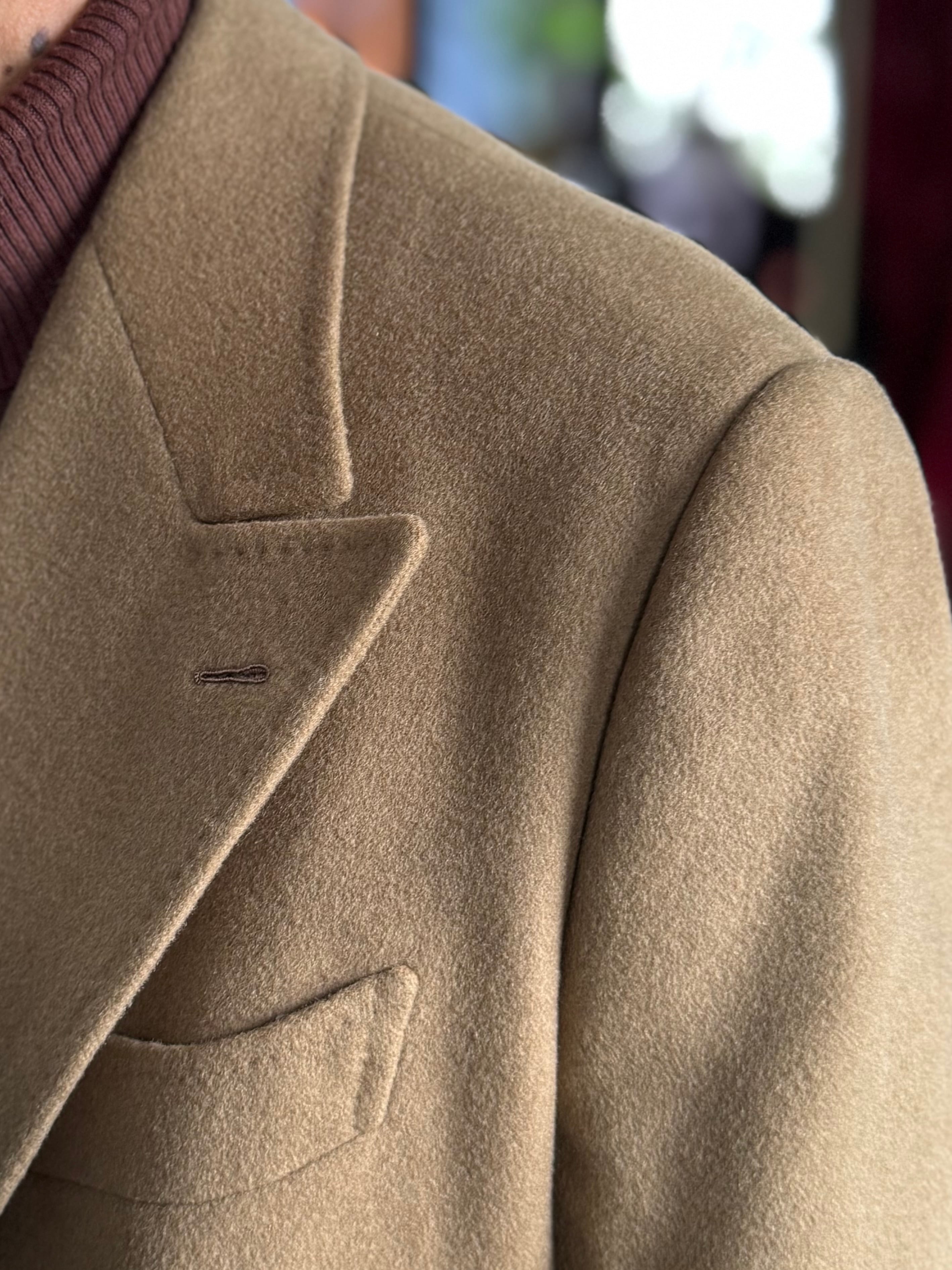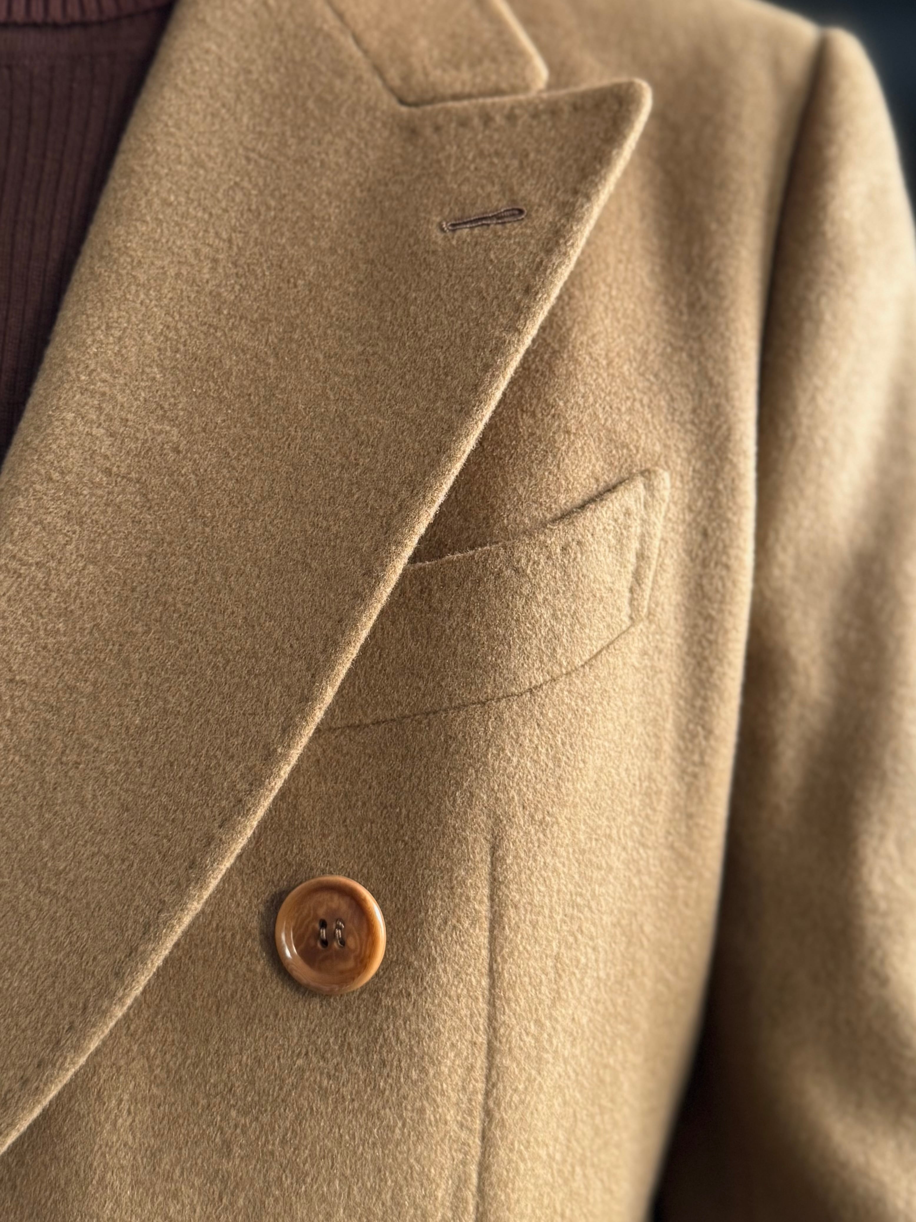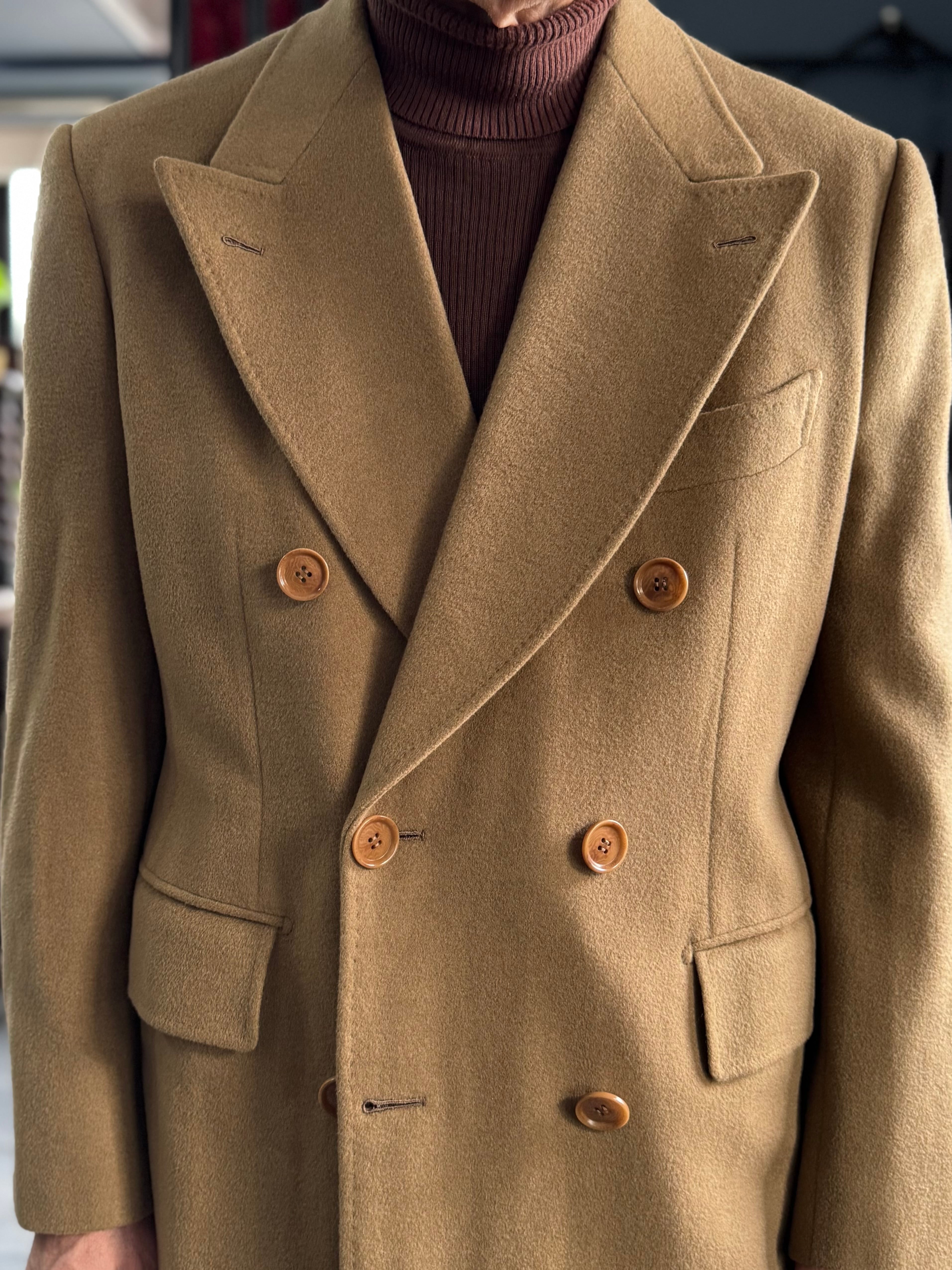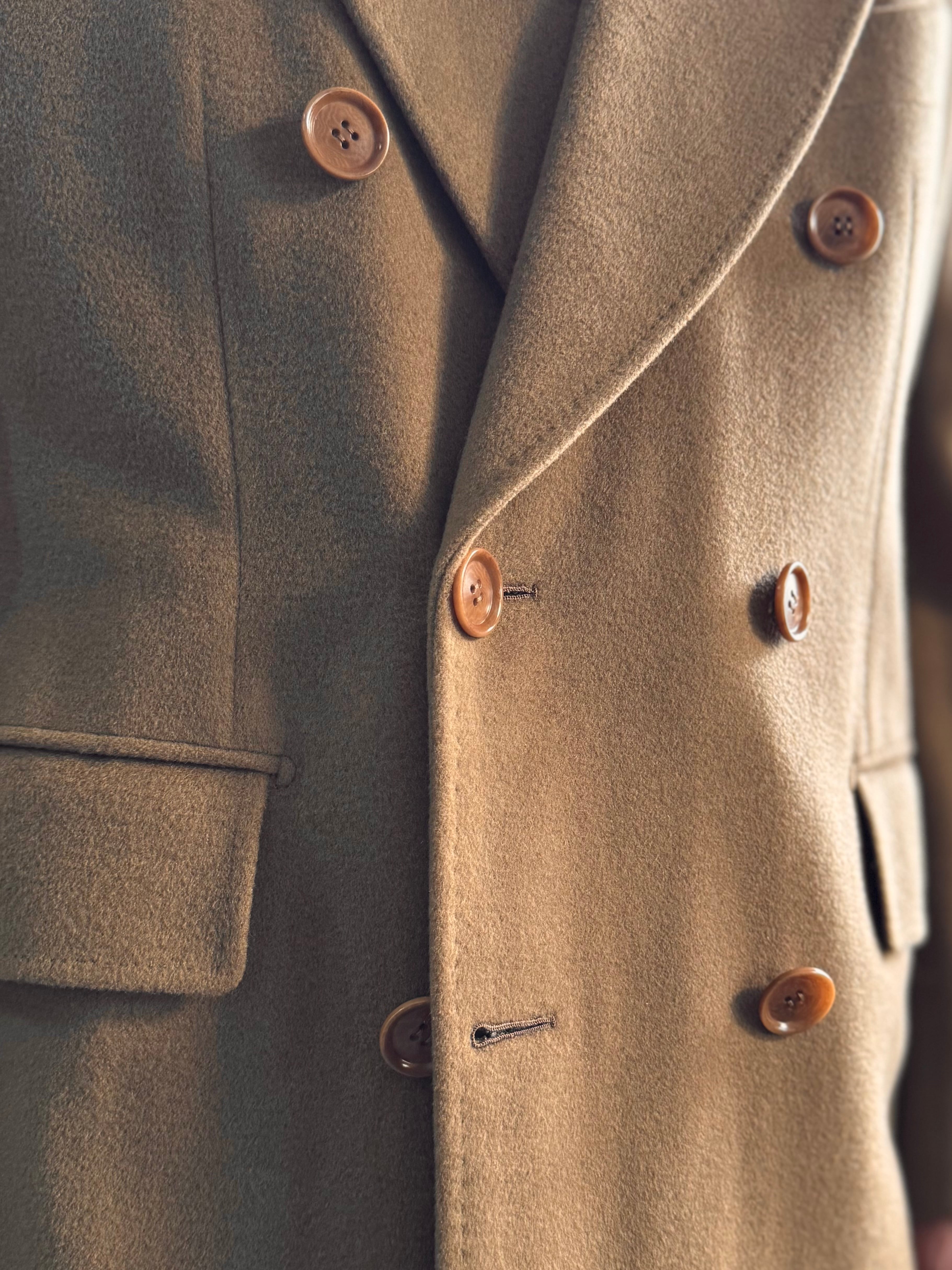 キャメル色のカシミヤ100%のダブルブレステッドコートです。カシミヤの魅せる上品な光沢感と端正のとれた衿の表情が着る人にエレガントさをもたらします。