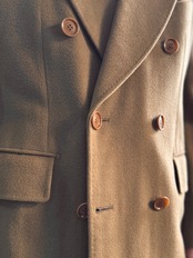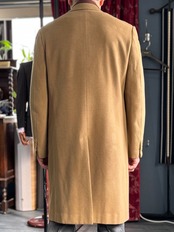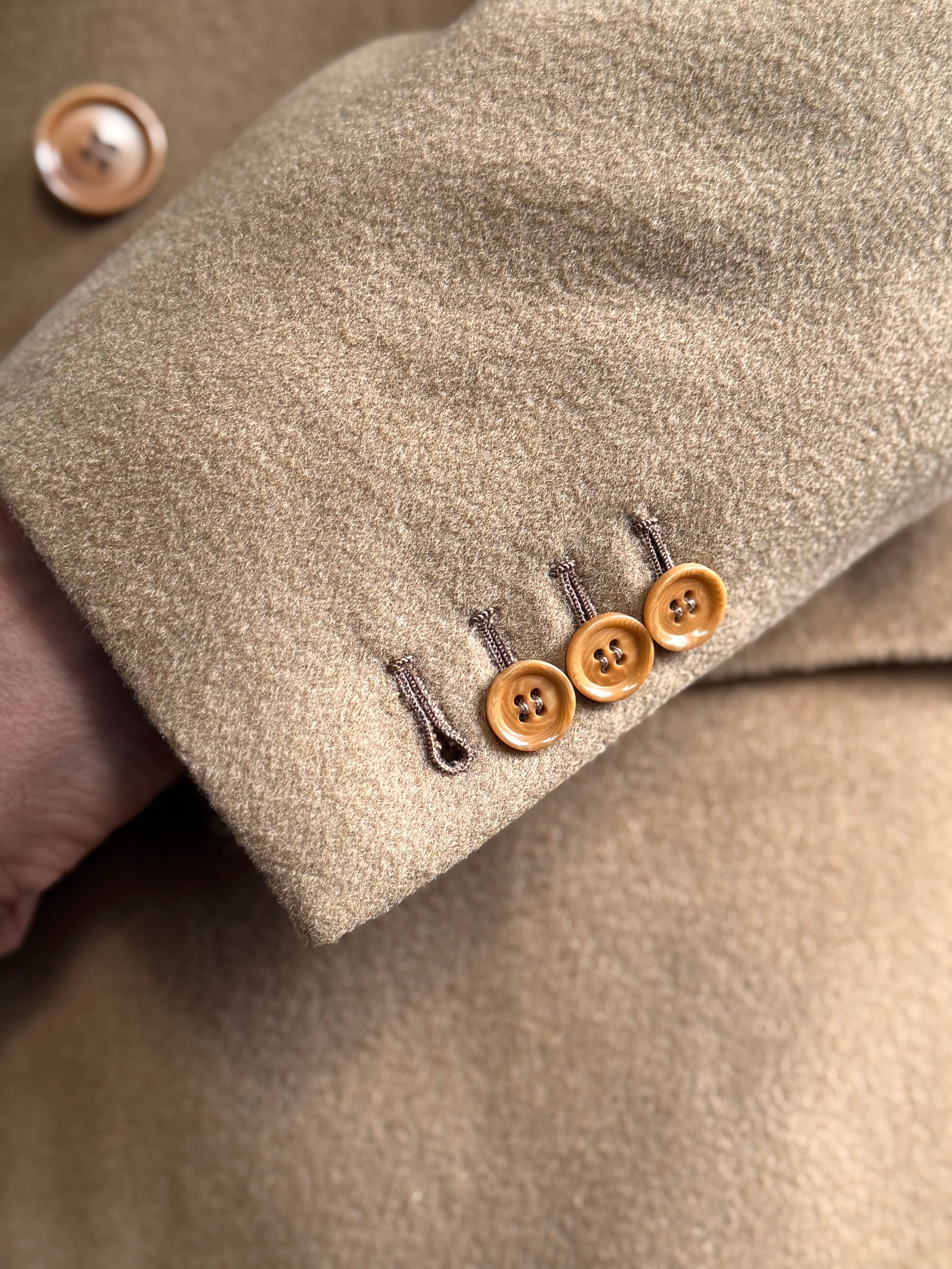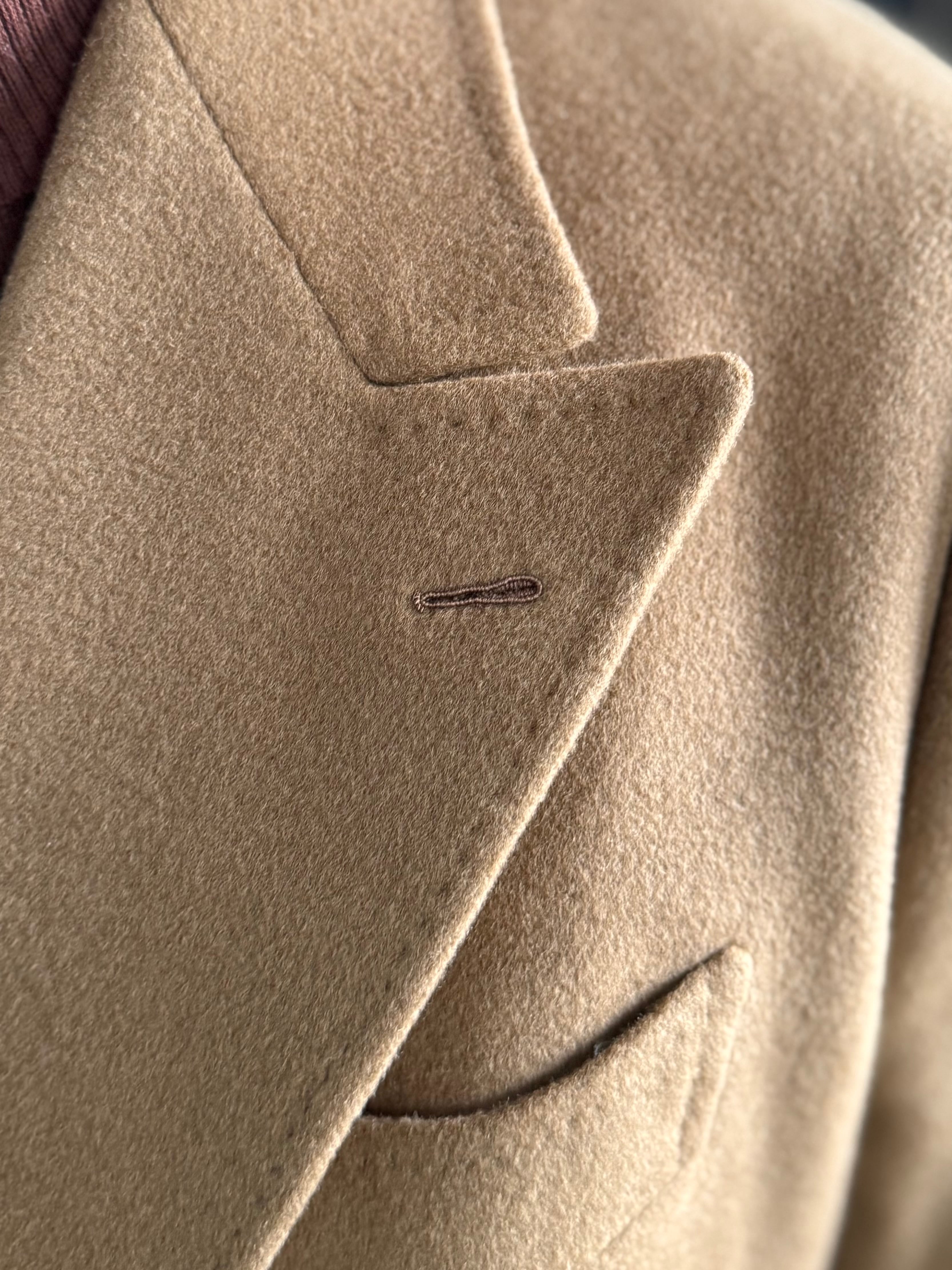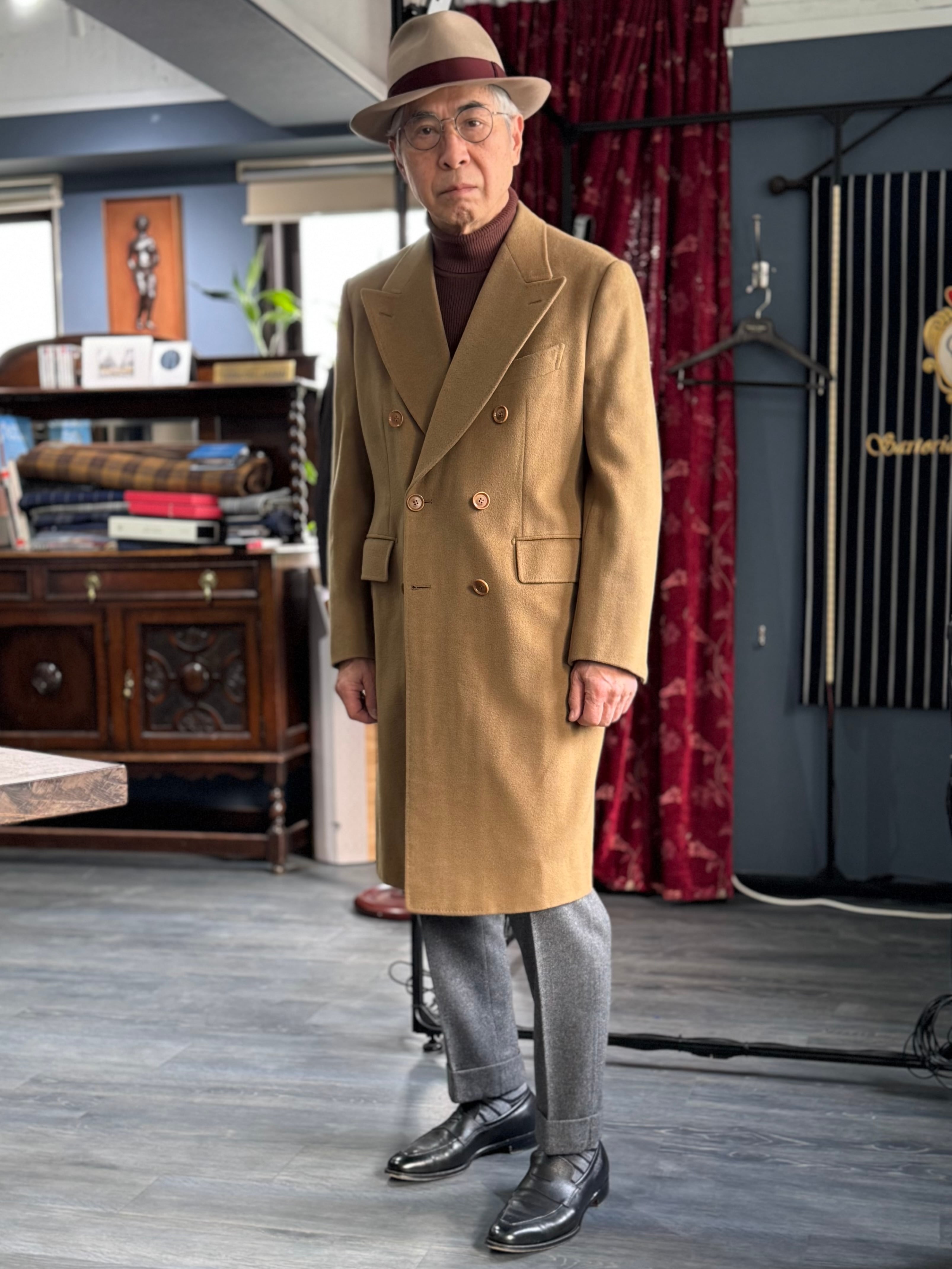 キャメル色のカシミヤ100%のダブルブレステッドコートです。カシミヤの魅せる上品な光沢感と端正のとれた衿の表情が着る人にエレガントさをもたらします。